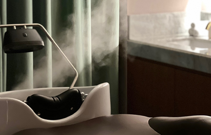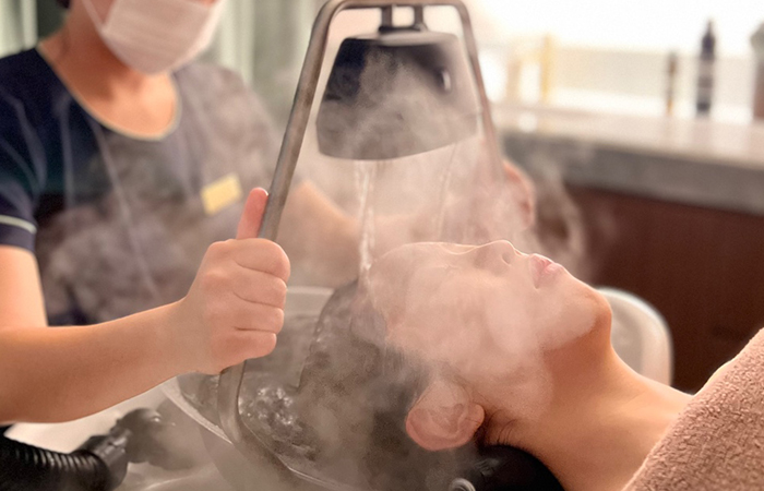 Welcoming ritual - Waterfall - Scalp scrub - Scalp warming&Foot mask - Technique&Shampoo - Waterfall - Scalp treatment&Technique - Décolleté technique - Hair treatment - Plain rinsing - Sparkling scalp toner - Hair essence - Finishing ritual
